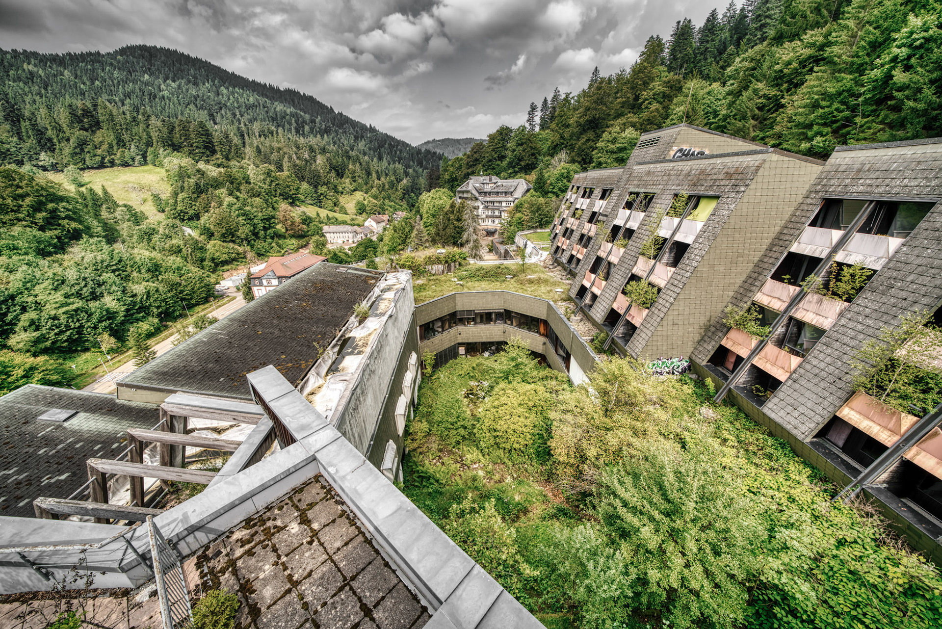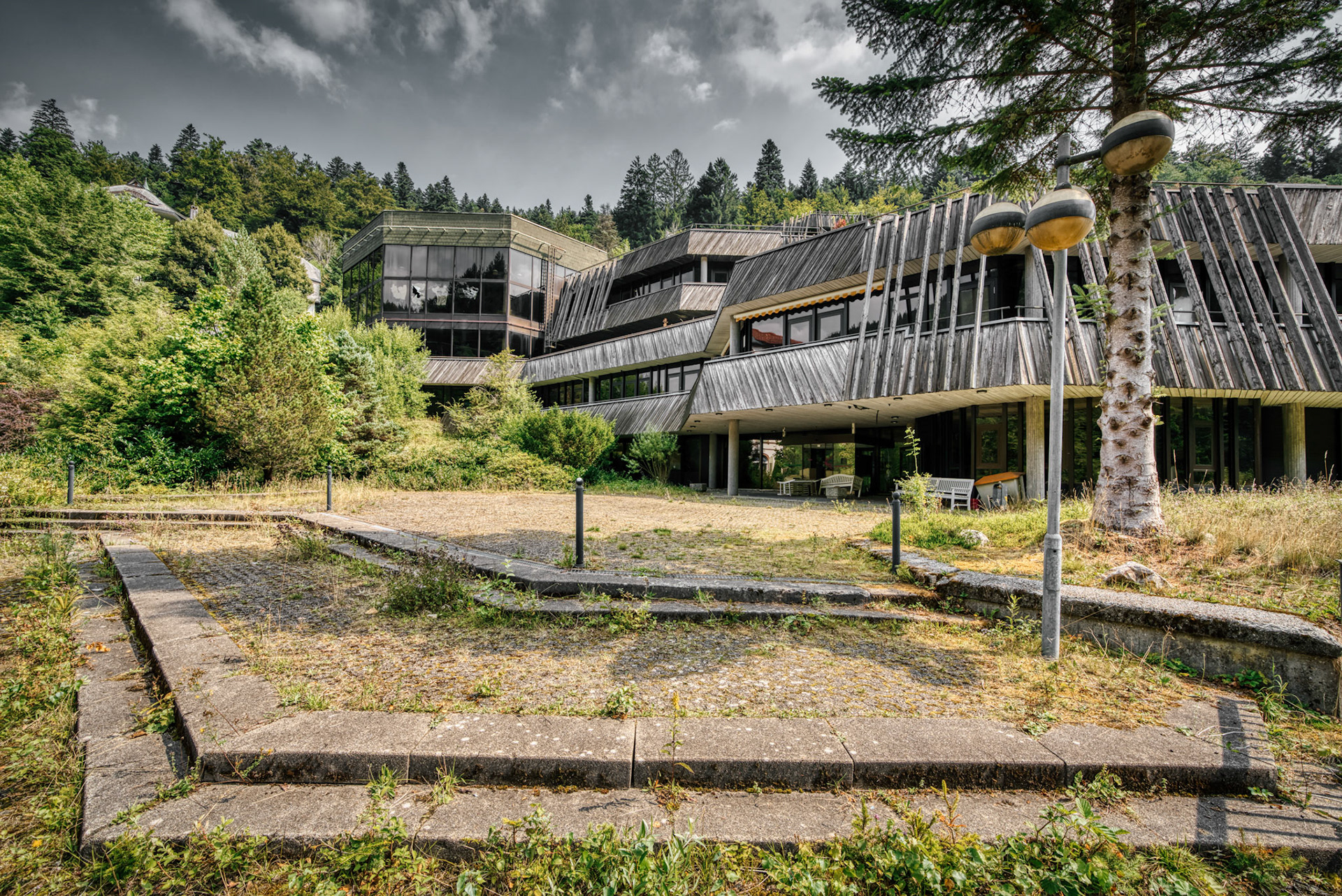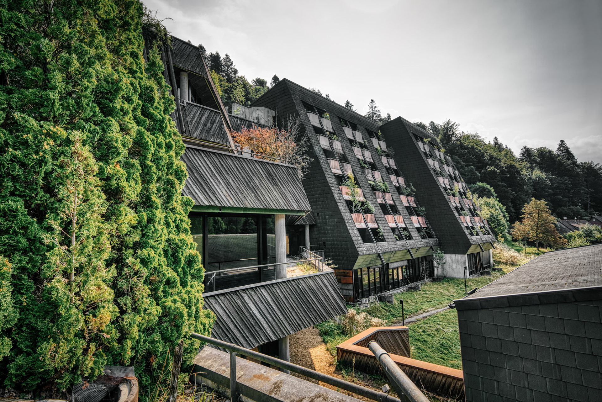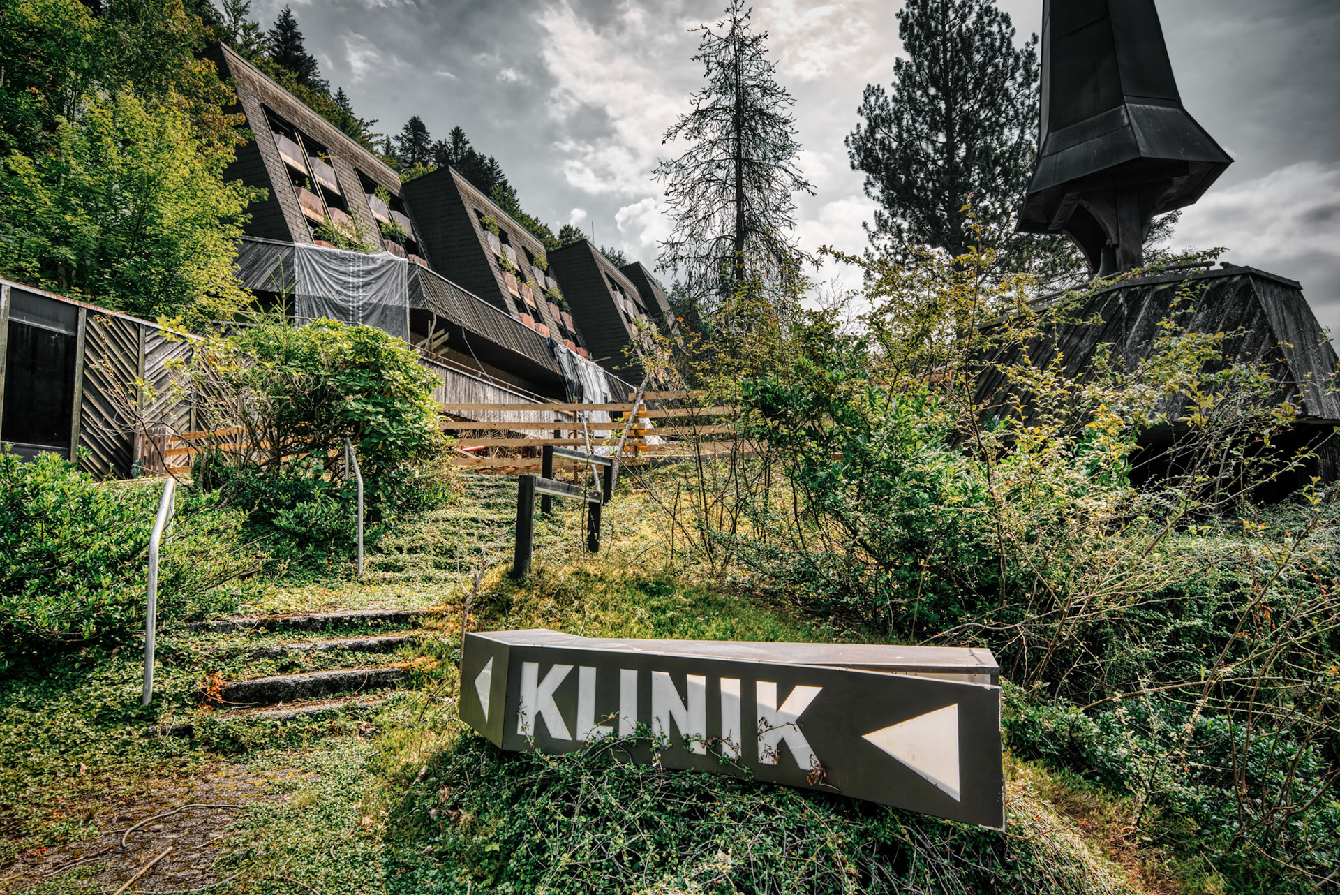 The abandoned Schwarzwaldklinik Bad Rippoldsau was once one of the largest rehabilitation and spa clinics in the region. Built in 1977, the complex covered about 30,000 square meters across four buildings, with around 200 single rooms, nearly 40 double rooms, staff accommodation, and a public thermal bath and sauna. It was widely promoted in advertising films and TV marketing programs in the 1990s.