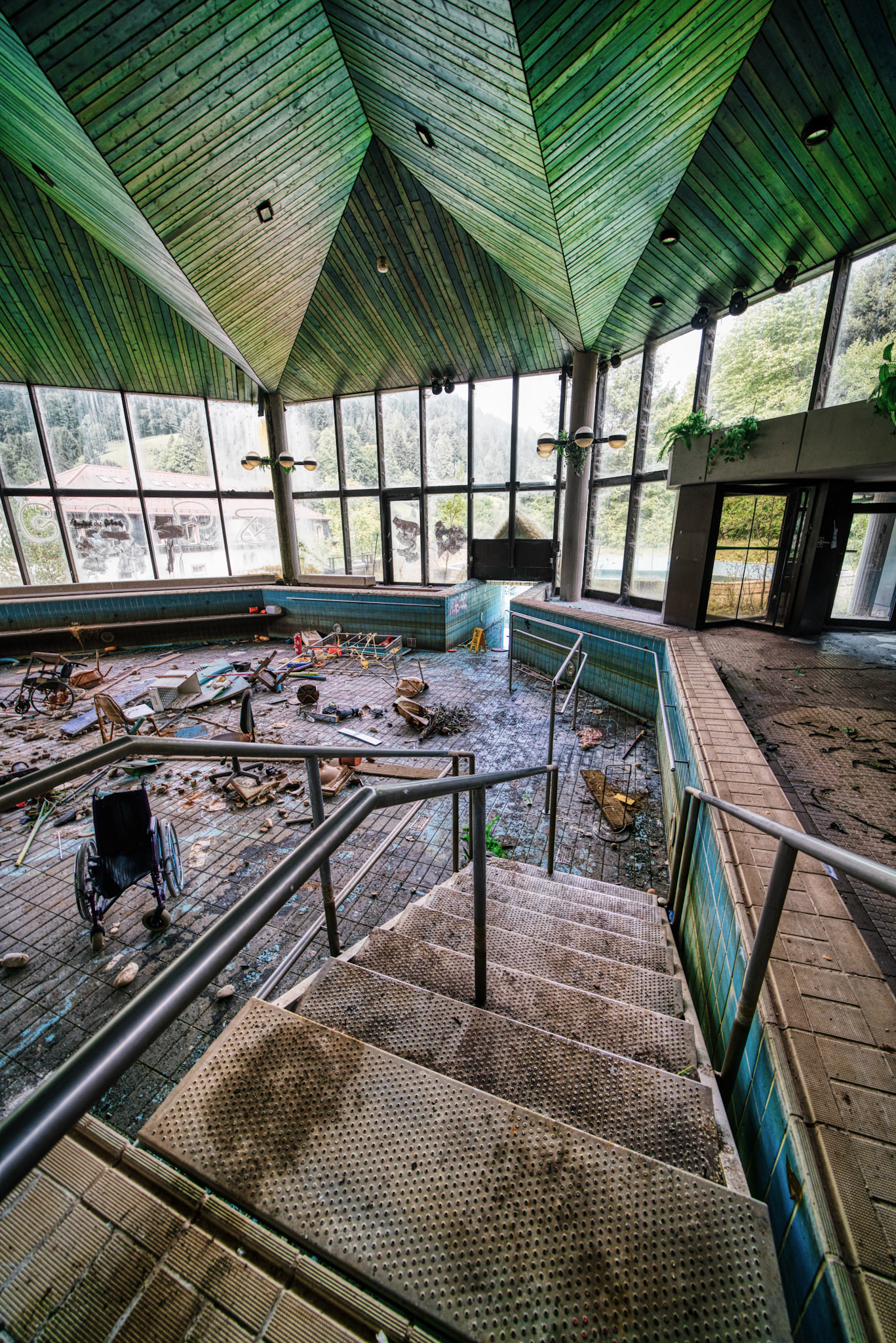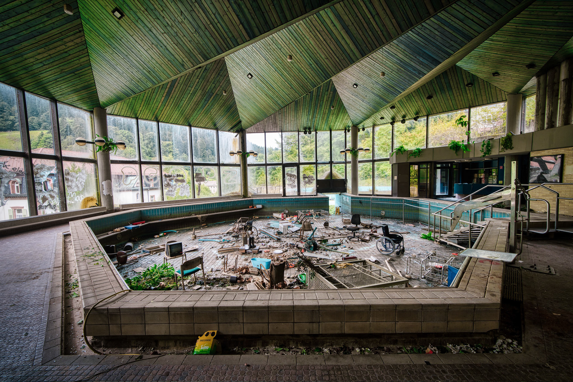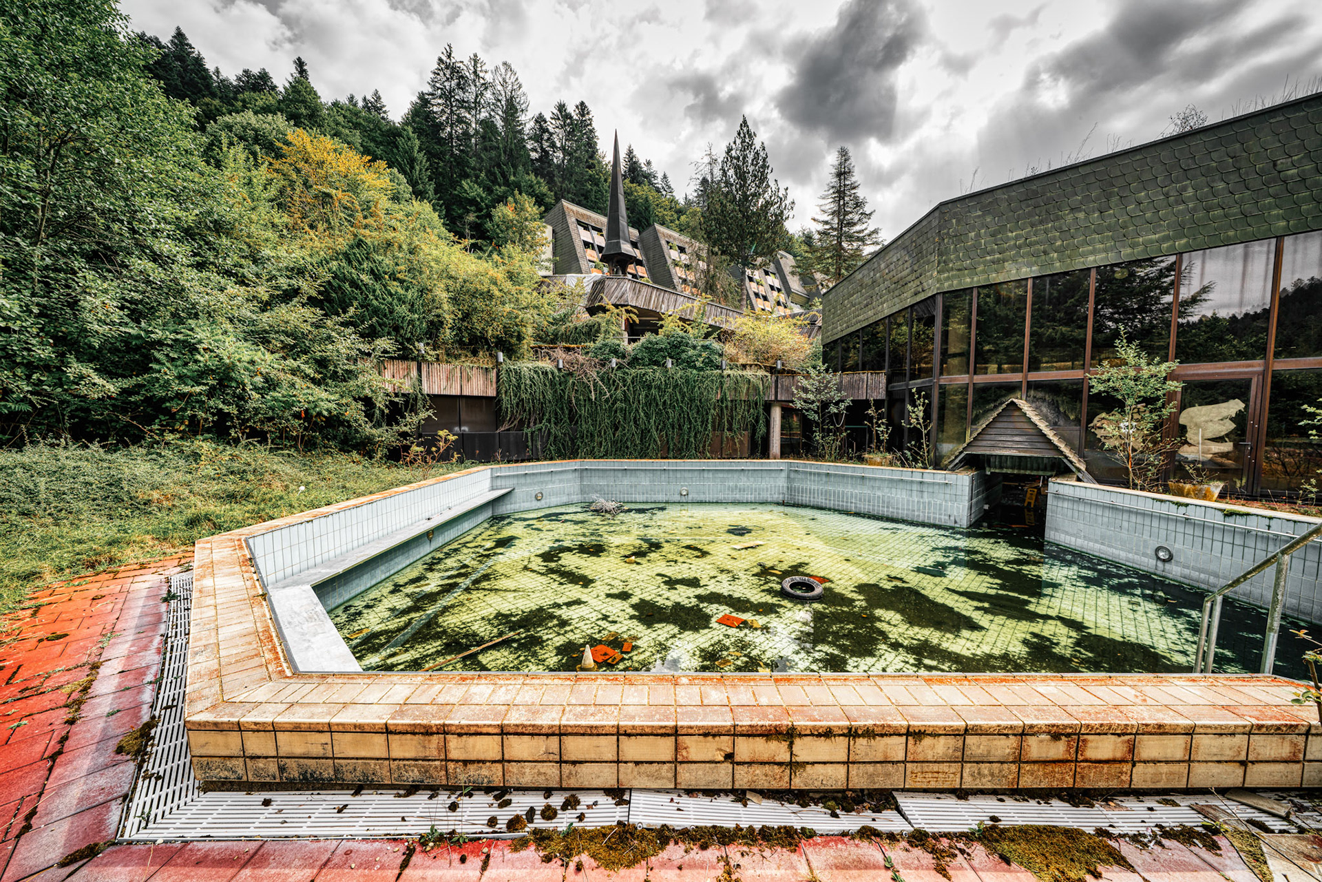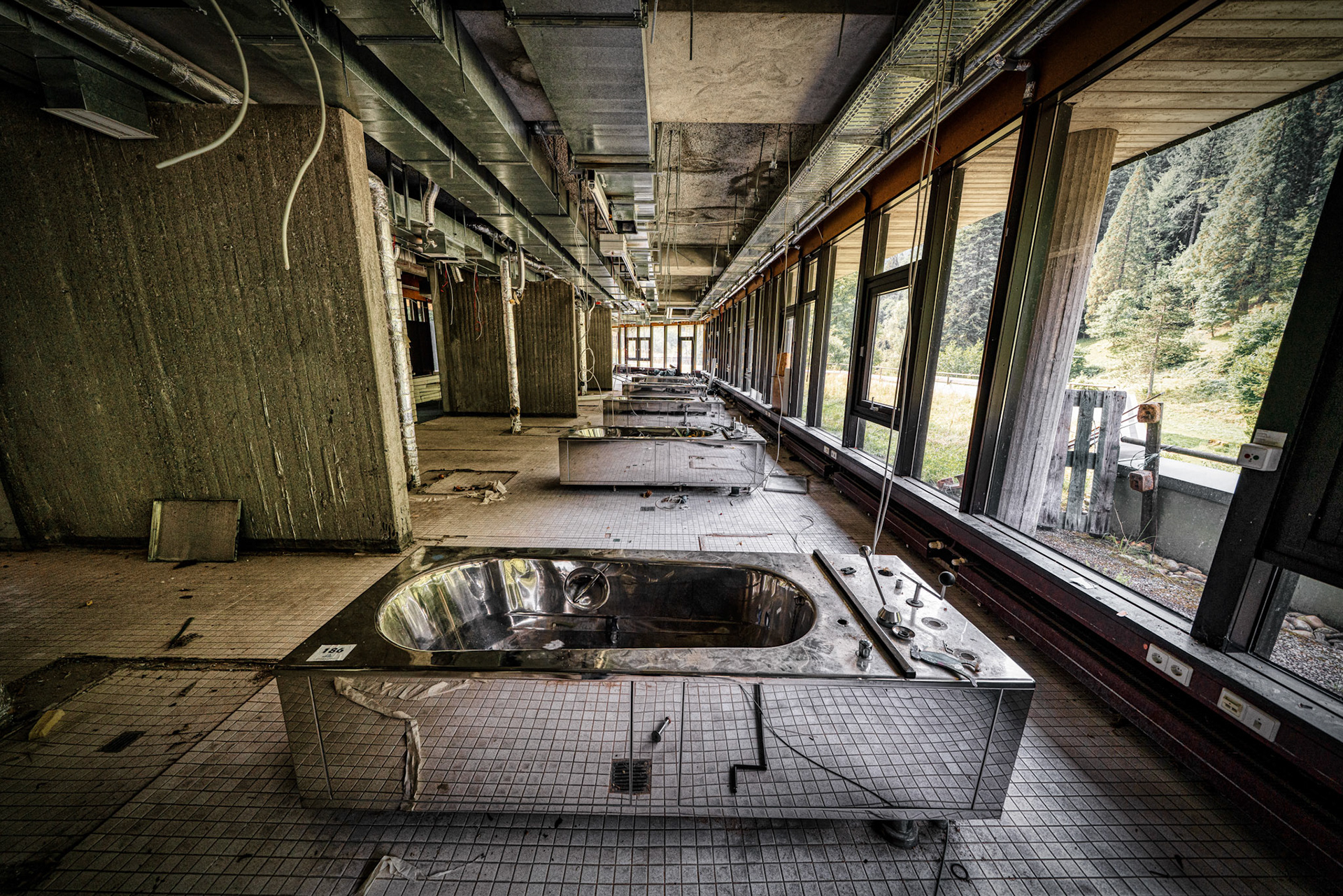 The abandoned Schwarzwaldklinik Bad Rippoldsau was once one of the largest rehabilitation and spa clinics in the region. Built in 1977, the complex covered about 30,000 square meters across four buildings, with around 200 single rooms, nearly 40 double rooms, staff accommodation, and a public thermal bath and sauna. It was widely promoted in advertising films and TV marketing programs in the 1990s.